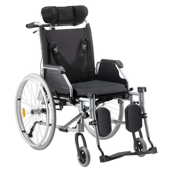Conta com cinto torácico, apoio de panturrilha com elevação, anti-tombo, almofada, apoio de braços e pernas escamoteáveis, e pedais com ajuste de altura