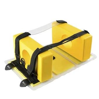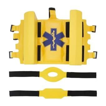 Produzido em ABS e com espuma de vinil emborrachada (EVA), este imobilizador é projetado para oferecer máxima segurança e praticidade. Ele se fixa com velcro ao tecido que reveste a prancha e conta com dois cintos de imobilização reguláveis para testa e queixo, assegurando um ajuste firme e seguro. Resistente a impactos, possui um orifício auricular de 80 mm (8 cm), que permite a verificação de sangramento sem a necessidade de remover o dispositivo. Além disso, seu material impermeável e lavável facilita a higienização e manutenção, tornando-o ideal para uso em diversas condições ambientais, incluindo resgates aquáticos.