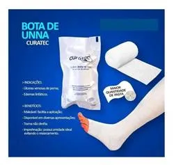O Curativo Bota de UnnaCURATEC geralmente utilizada em cuidados de feridas, que oferece compressão e suporte à área afetada. Com dimensões de 10,2 cm de largura e 9,14 m de comprimento, é projetado para se ajustar confortavelmente em torno da perna ou pé, promovendo a adesão e eficácia do tratamento.